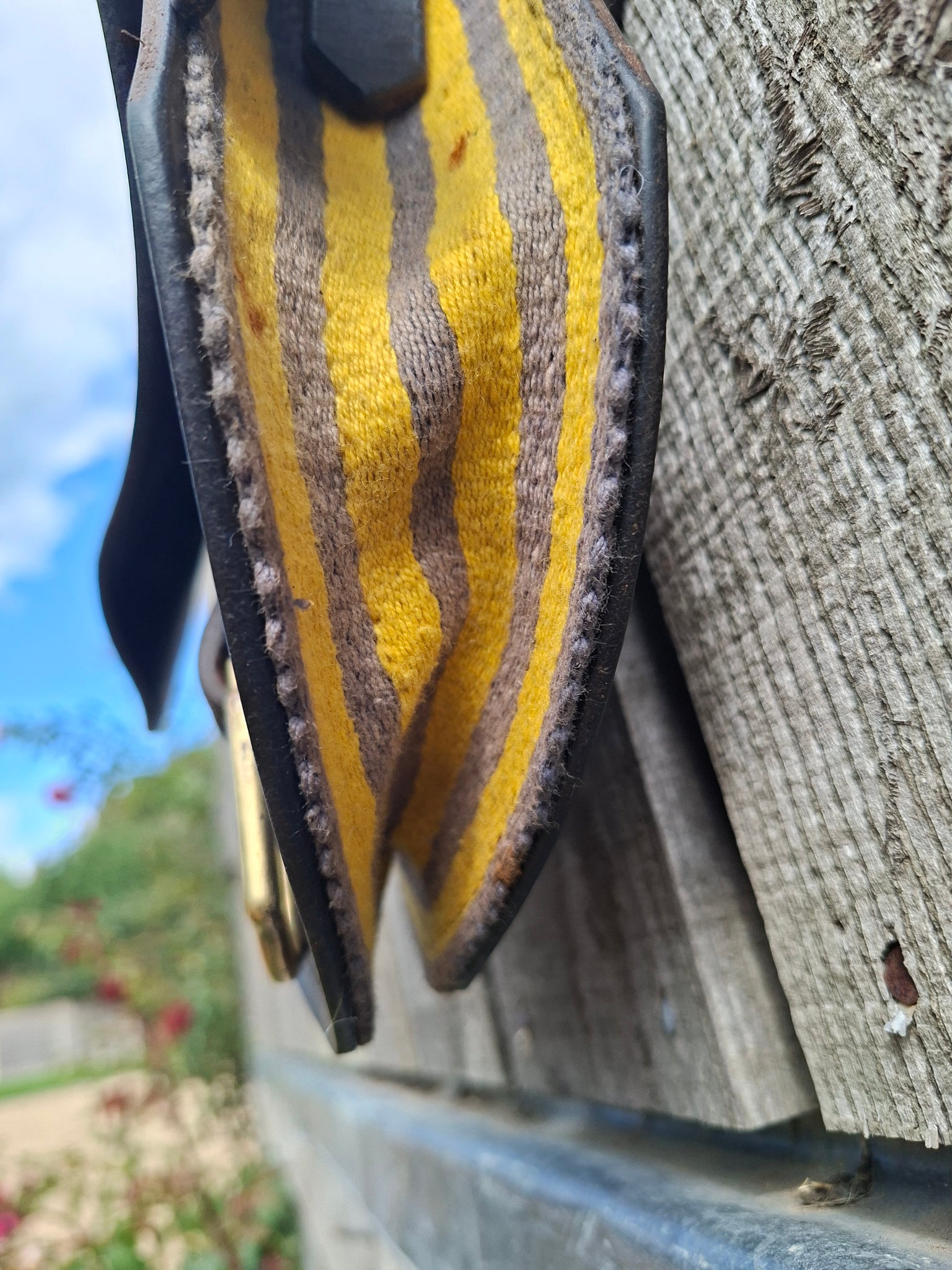 She is an unusual shape with a lovely vintage yellow striped woven girth as a gusset